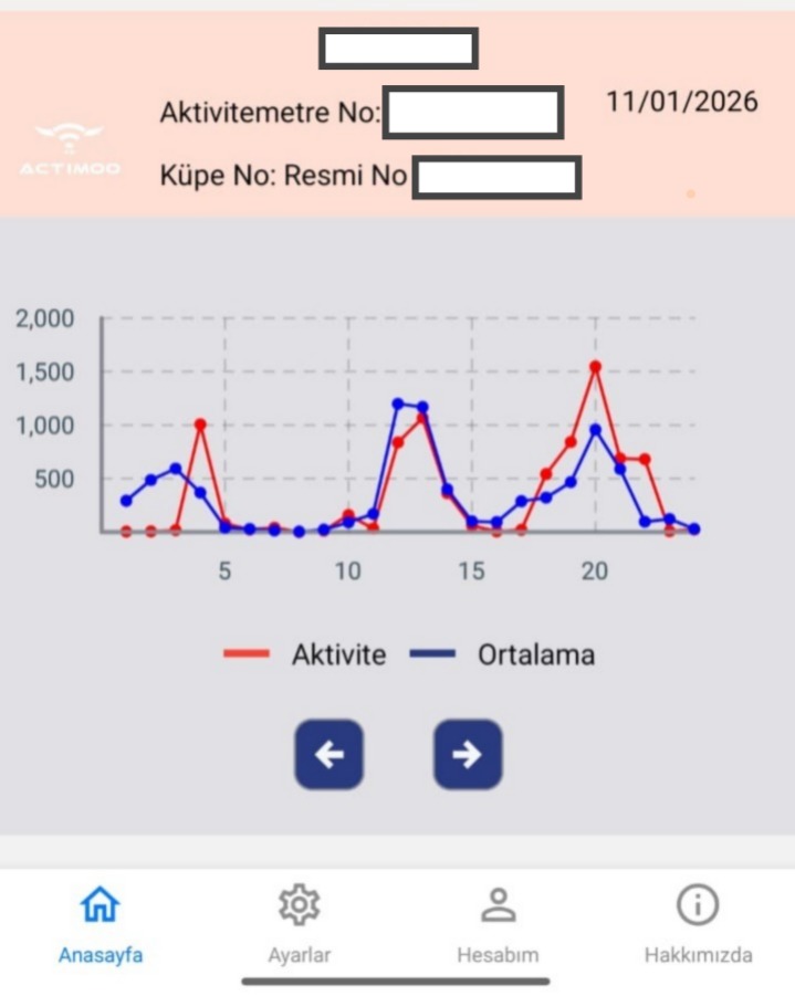 Grafiğin üst kısmında yer alan rengin mavi olması, cihazdan gelen veri akışının normal şekilde devam ettiğini gösterir. Grafiğin üst kısmı kırmızı renkte ise, hayvanda normalin üzerinde bir hareketli…