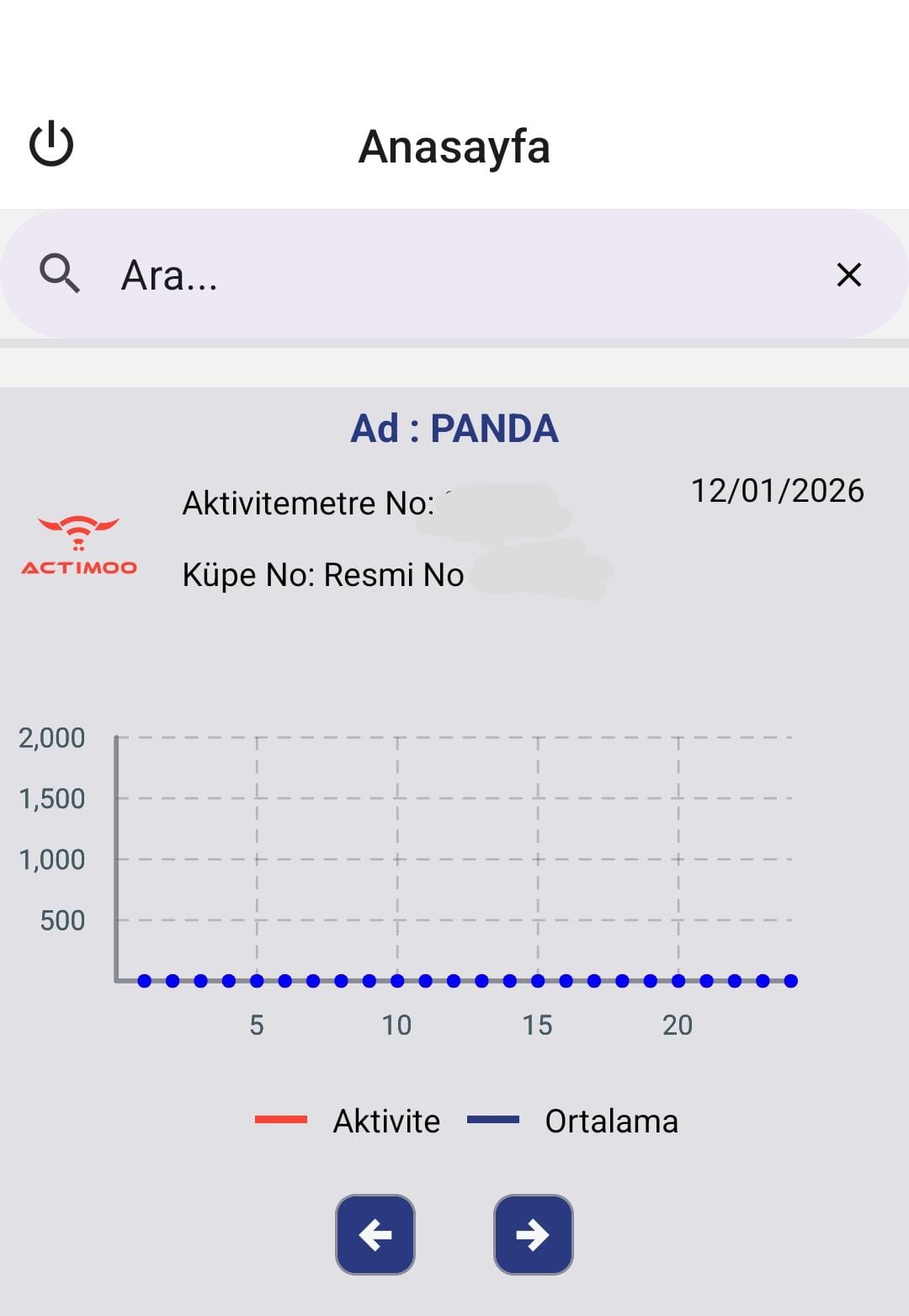 ⚠️ Önemli: 5. saatten sonra veri ortalama değeri altında kalmaya devam ediyorsa ve hayvanda belirgin bir hareketlilik gözlemleniyorsa, veteriner hekiminiz ile iletişime geçiniz. - Grafiğin üst kısmının soluk gri renkte görünmesi, cihazdan veri alınamadığını ifade eder.