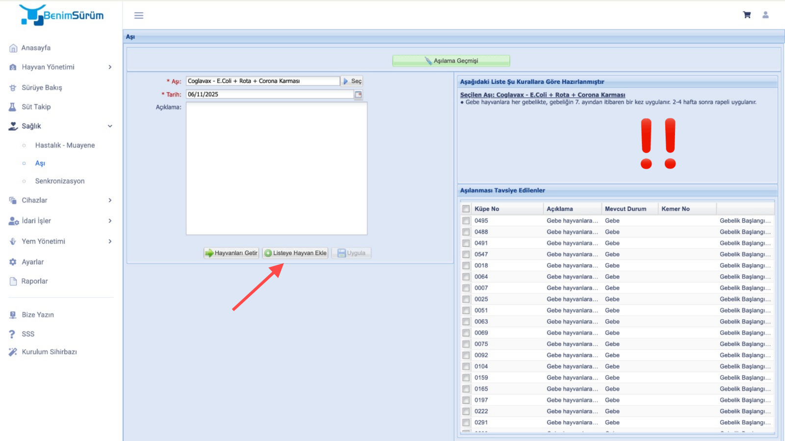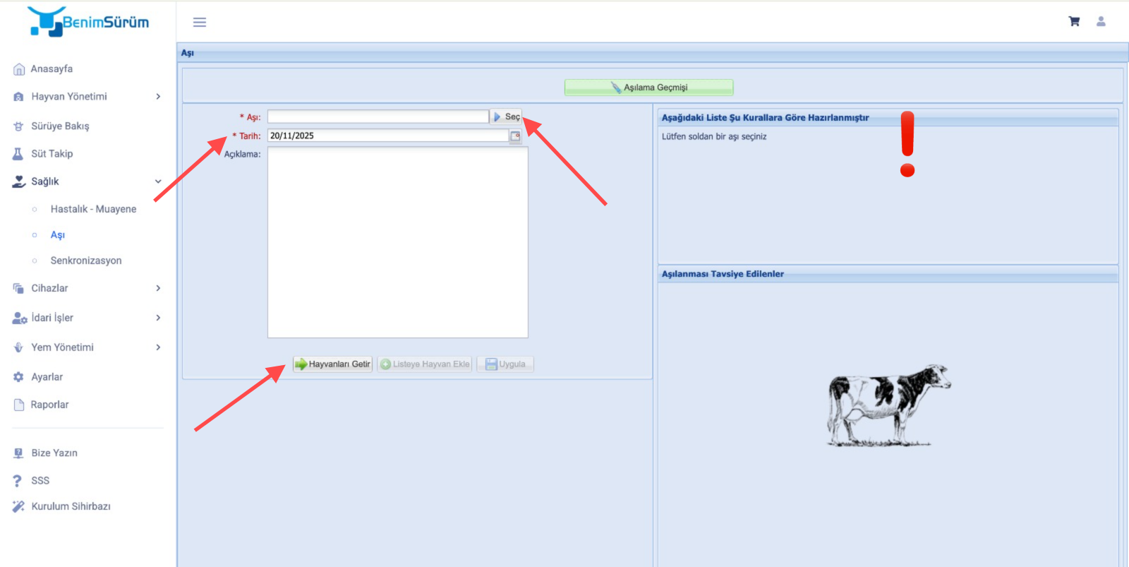 - Açılan ekranda "Seç" diyerek hayvanınıza uygulayacağınız aşıyı seçiniz. "Tarih" seçeneğinden uygulamanın yapıldığı tarihi belirleyiniz. "Hayvanları Getir" seçeneğine tıkladığınızda, hayvanlarınız ekranın sağ tarafında listelenecektir. "!" işareti ile belirtilen özelliklere göre hayvanlar burada sıralacaktır.