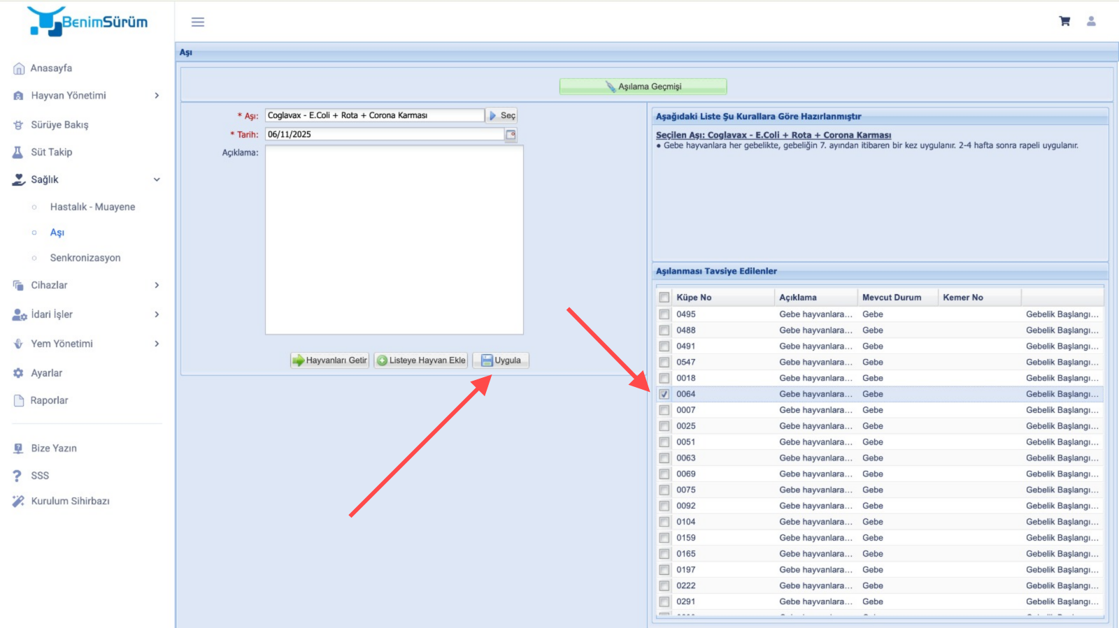 - Hayvanı seçtikten sonra "Uygula" butonu aktif olacaktır. İşlem yapmak istediğiniz hayvanları seçip Uygula’ya tıklayın. Seçilen aşı hayvanlarınıza uygulanacaktır.