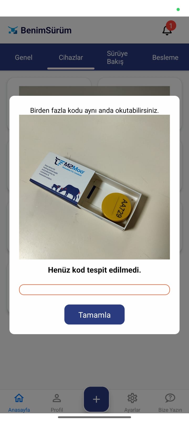 Yukarda gösterildiği gibi, yapılan kod okutma işlemi başarılı ise ekranda yeşil onay işareti görüntülenecektir. Ayrıca, “tespit edilen kod sayısı” bölümünde okutulan toplam kod adedi gösterilecektir. Bu alanların kontrol edilmesi, işlemin doğru şekilde tamamlandığından emin olunması açısından önemlidir. - Aktivasyon işlemi tamamlandıktan sonra cihazlar hayvanlara takılmalıdır. Cihazlar takıldıktan birkaç saat sonra veriler sisteme aktarılmaya başlayacaktır.