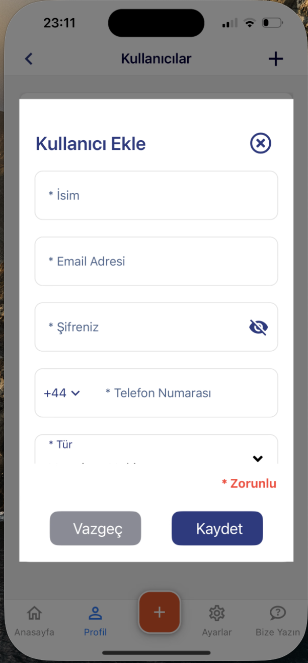 Benim sürüm uygulamanıza giriş yapınız. Ana sayfanızda aşağıdaki panelde yer alan "profil" sekmesine tıklayın. " Kullanıcılar " sekmesine tıklayın. Sağ üstte yer alan "+" butonunu kullanarak yeni kul…