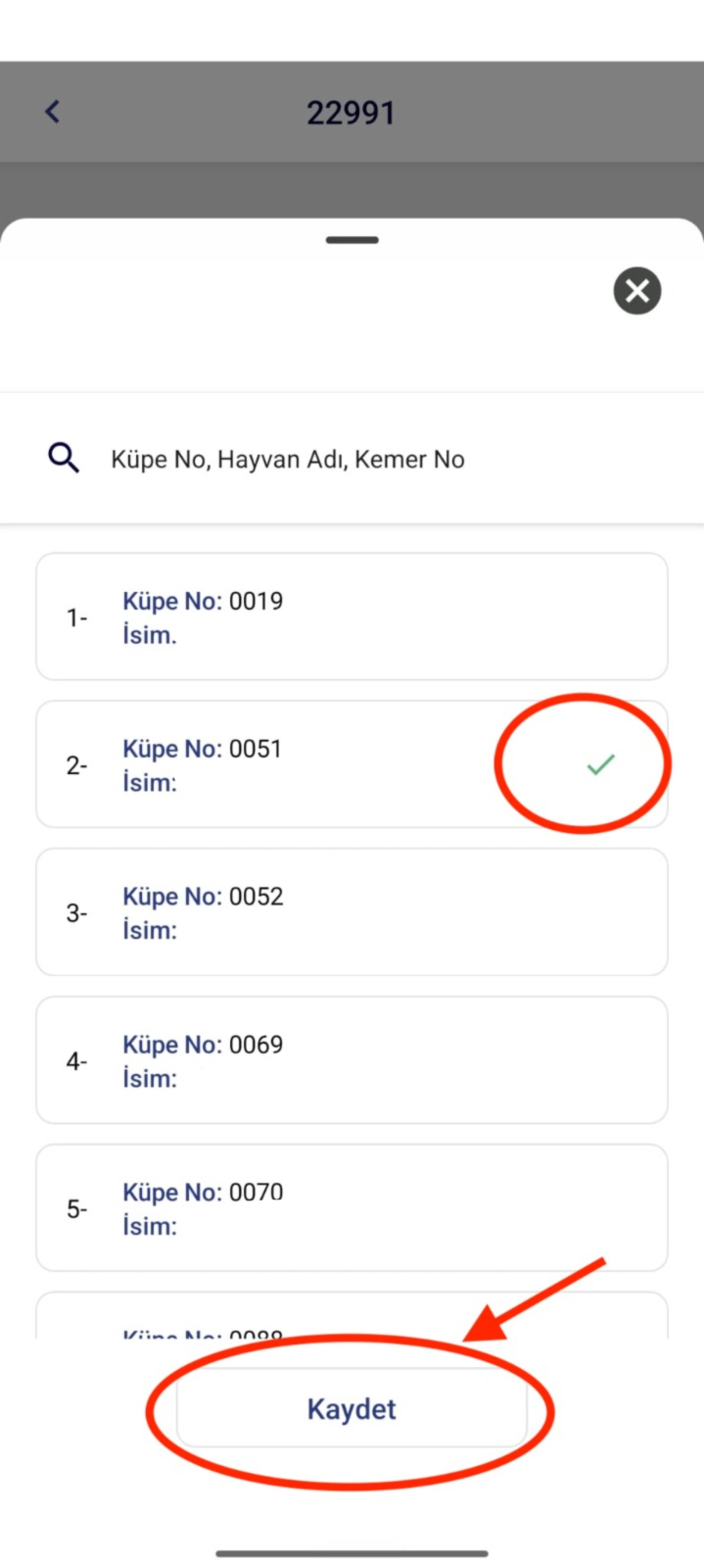 - Cihazı takmak istediğiniz hayvanı seçiniz. Bu seçimden sonra, hayvan bilgilerinin yanında yeşil bir onay işareti görüntülenecektir.