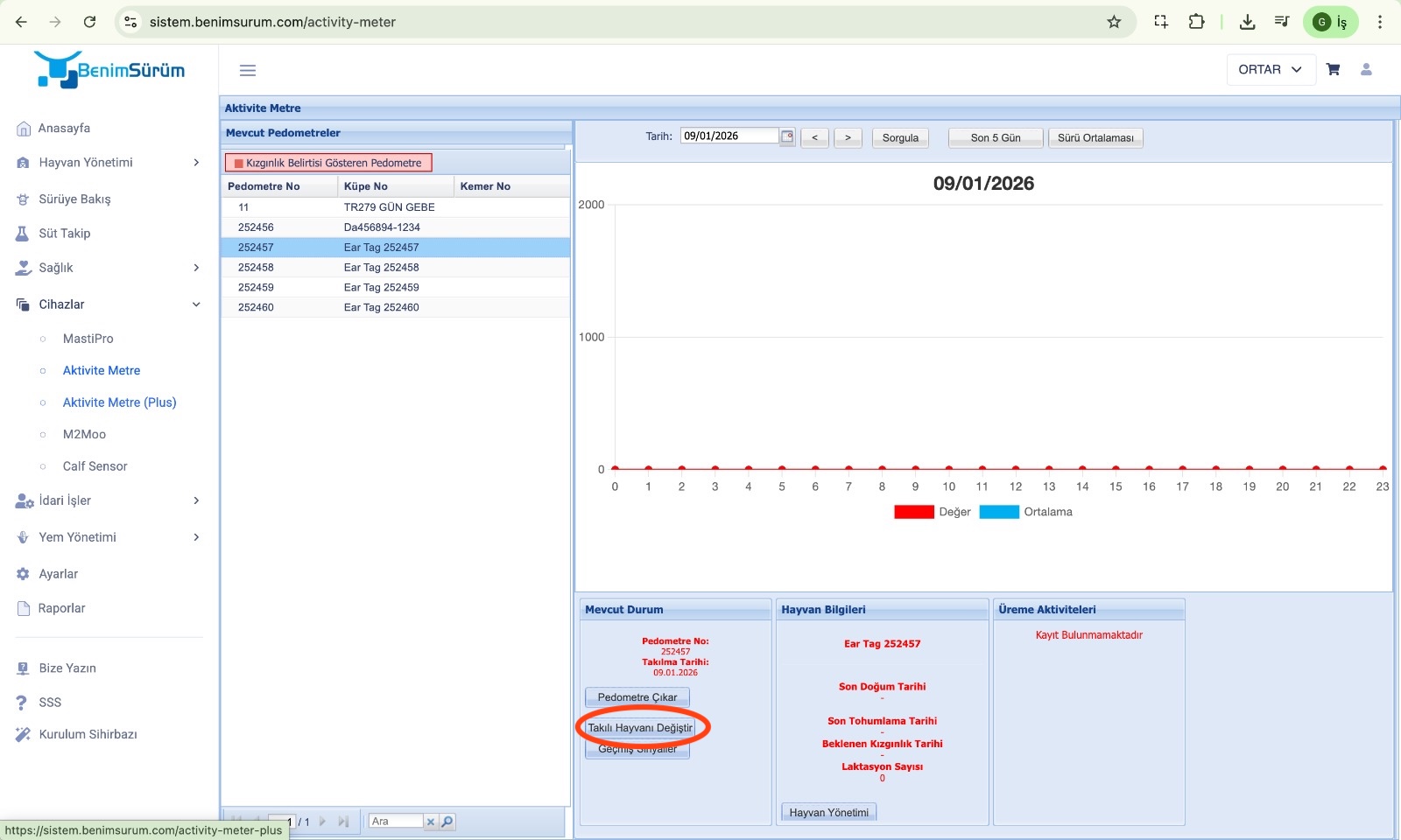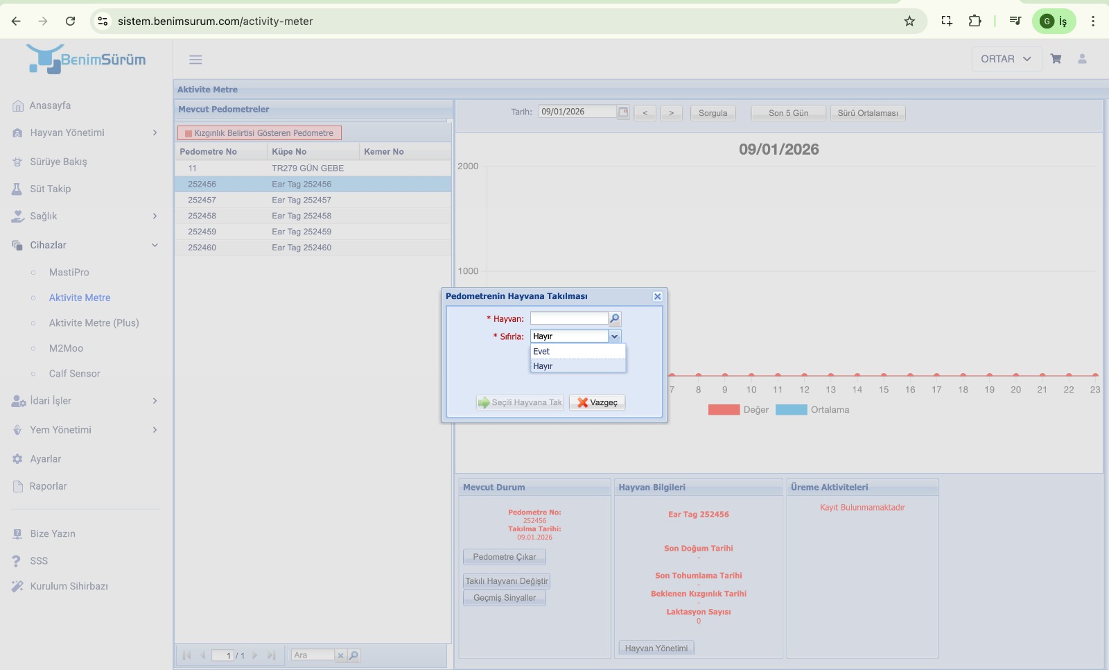 - İlgili cihaz için Takılı Hayvanı Değiştir butonuna tıklayınız. Açılan ekranda Sıfırlama seçeneğini “Evet” olarak işaretleyiniz.