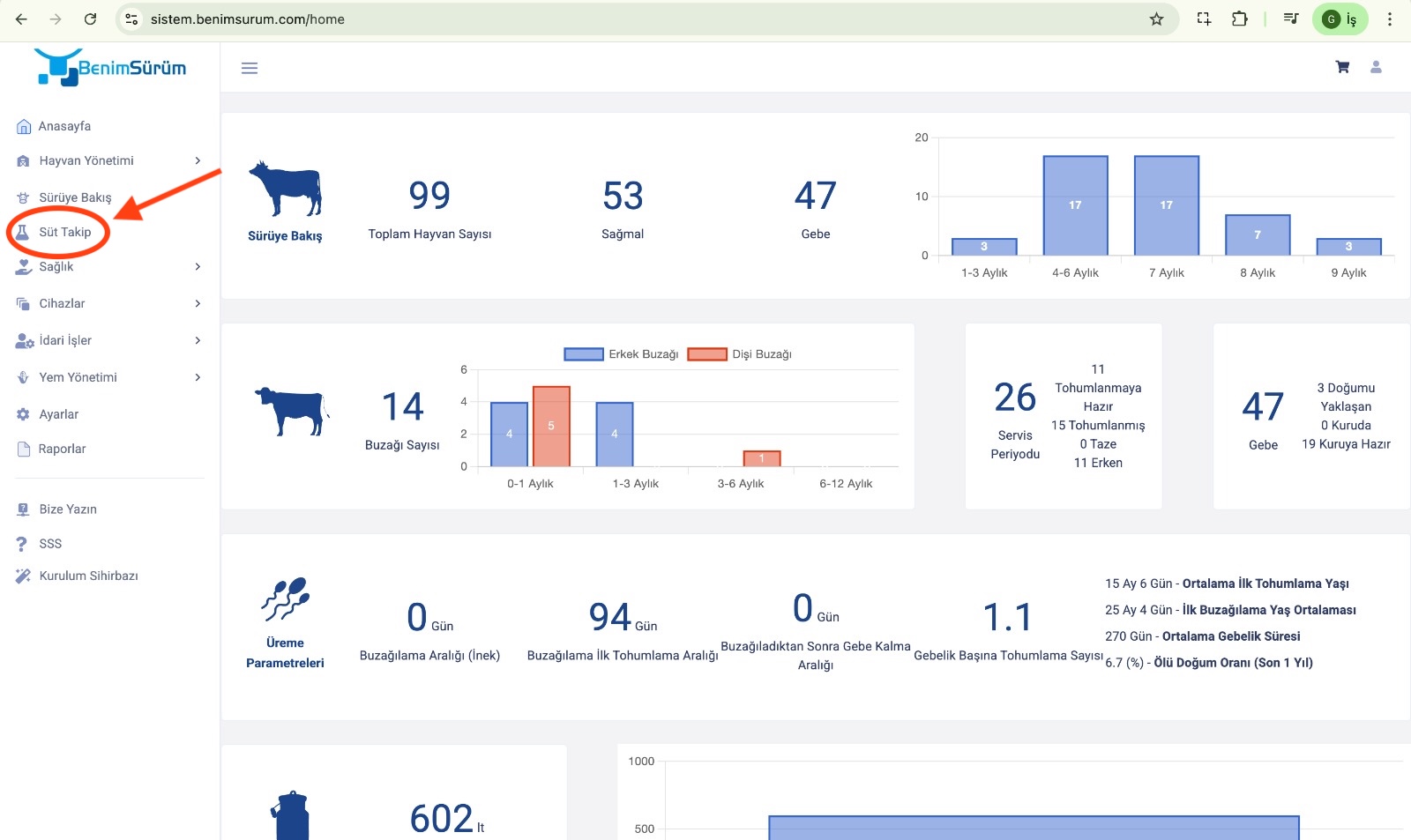 - Sol menüde yer alan "Süt Takip" sekmesini seçiniz.