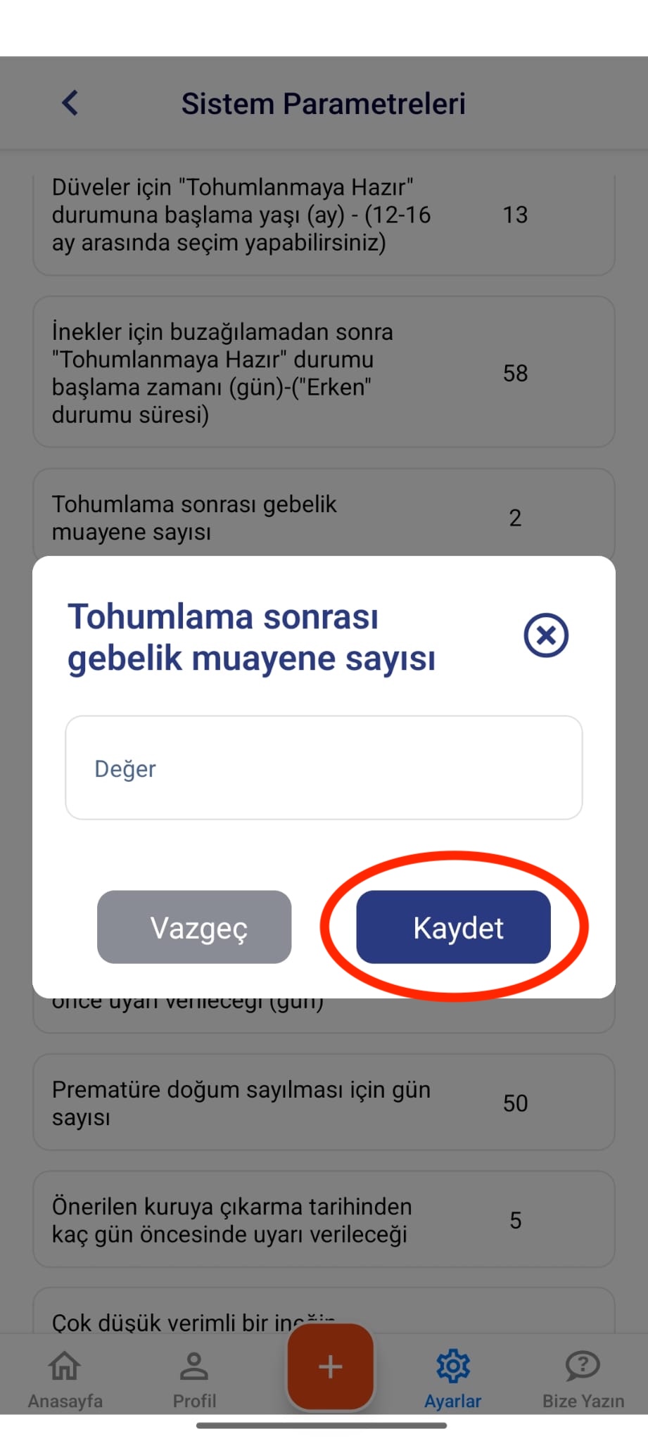 - Açılan ekranda “Tohumlama Sonrası Gebelik Muayene Sayısı” parametresini 2 olarak ayarlayın ve Kaydet butonuna basın. Ardından “Tohumlamadan Sonraki 2. Gebelik Kontrolünün Yapılacağı Gün” parametresine, çiftliğinizde uygulanmasını istediğiniz gün bilgini girin ve ayarı tamamlamak için tekrar Kaydet butonuna basın.