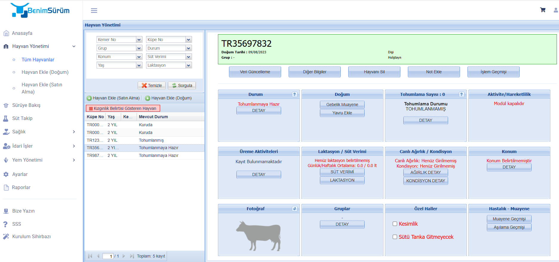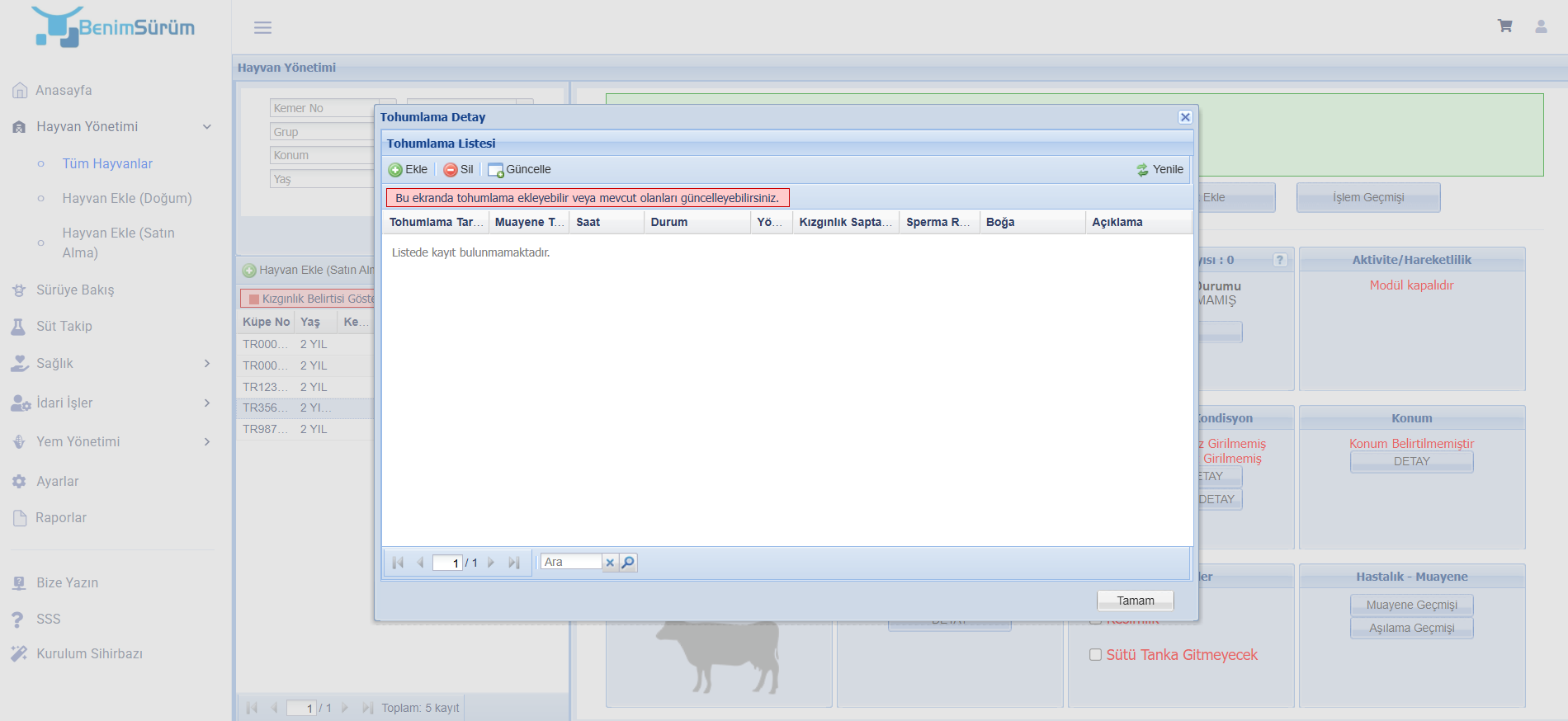www.benimsurum.com.tr web sitemizden kullanıcı adı ve parolanız ile giriş yaparak uygulamayı açınız. Hayvan Yönetimi -> Tüm Hayvanlar -> Tohumlama eklemek istediğiniz hayvanı seçiniz. Web uygulamasın…