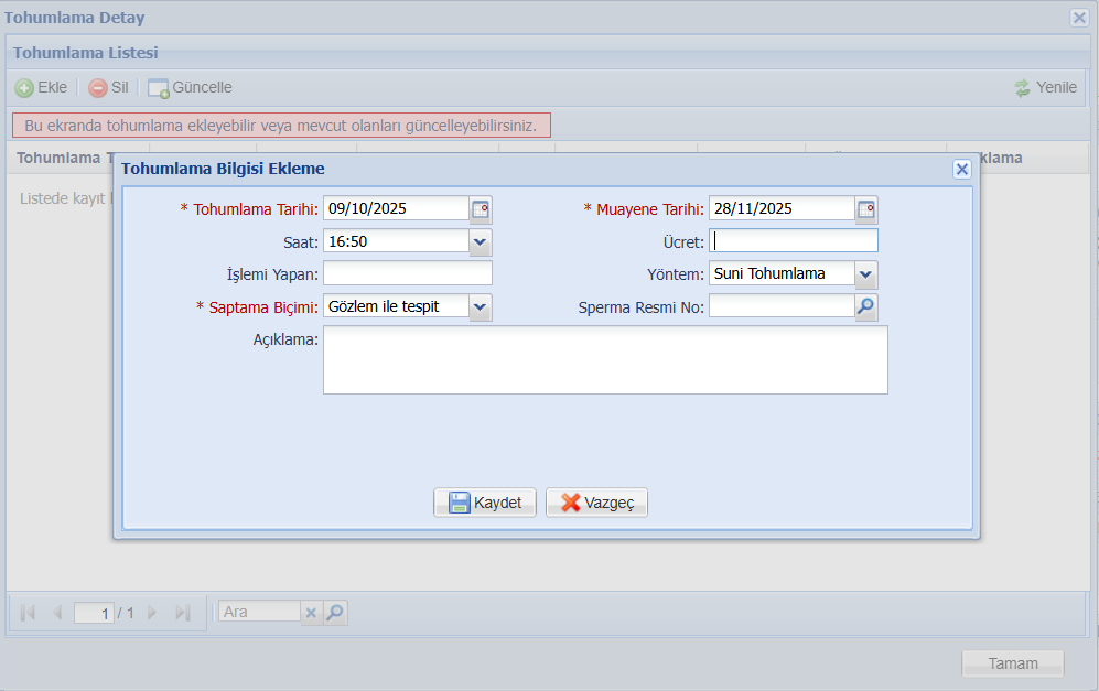 Tohumlama tarihini doğru girdiğinizden emin olunuz. Girilen tohumlama tarihine göre sistem öngörülen gebelik muayene zamanında sizi bilgilendirecektir.