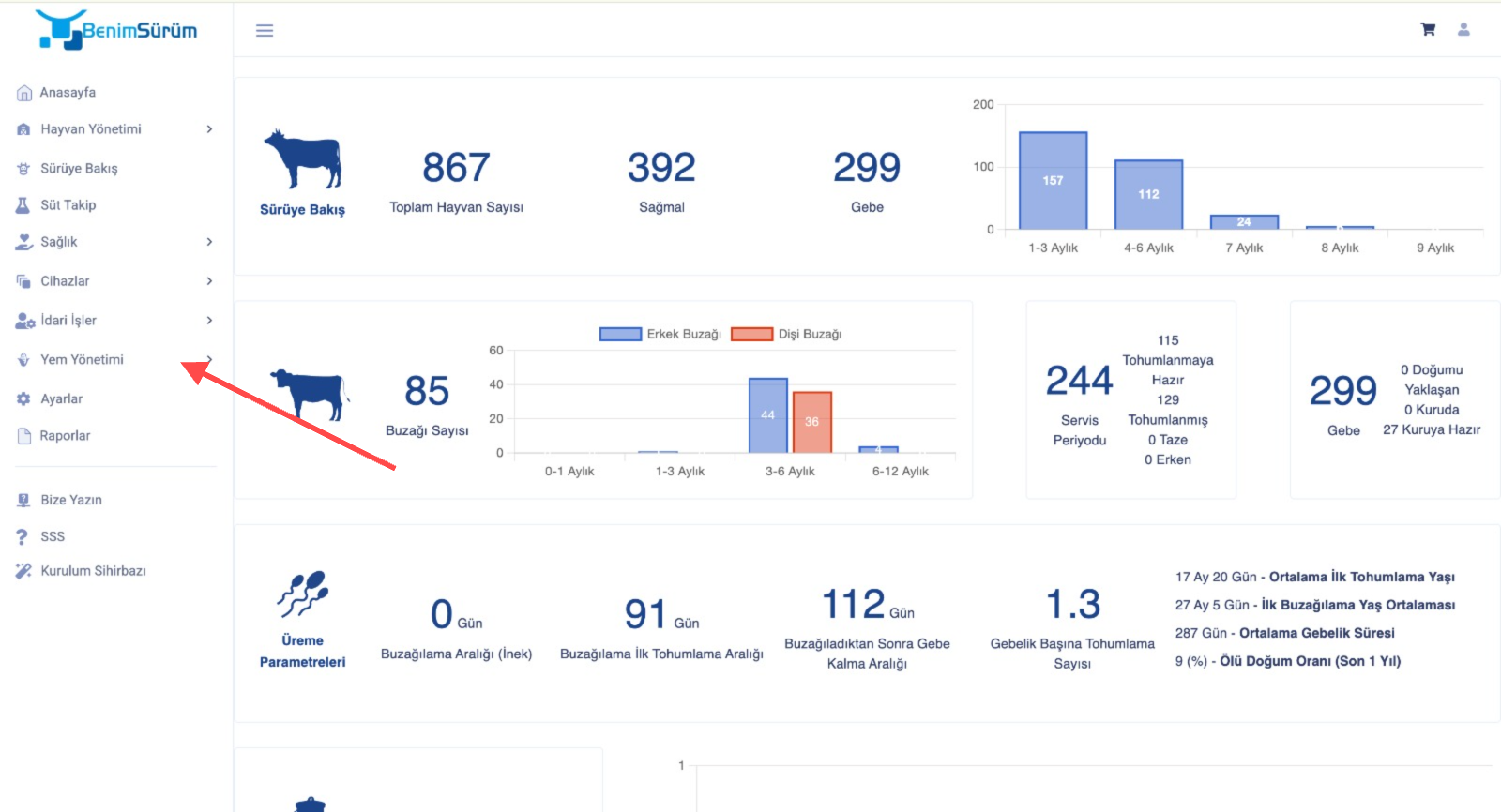 - Ana sayfada, sol menüde yer alan "Yem Yönetimi" sekmesine tıklayın.