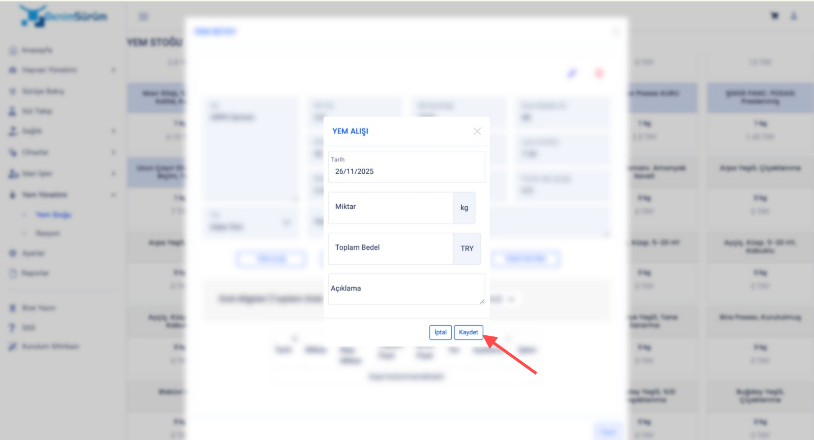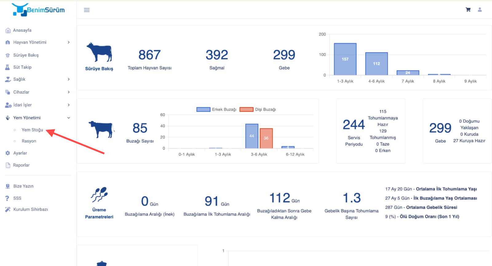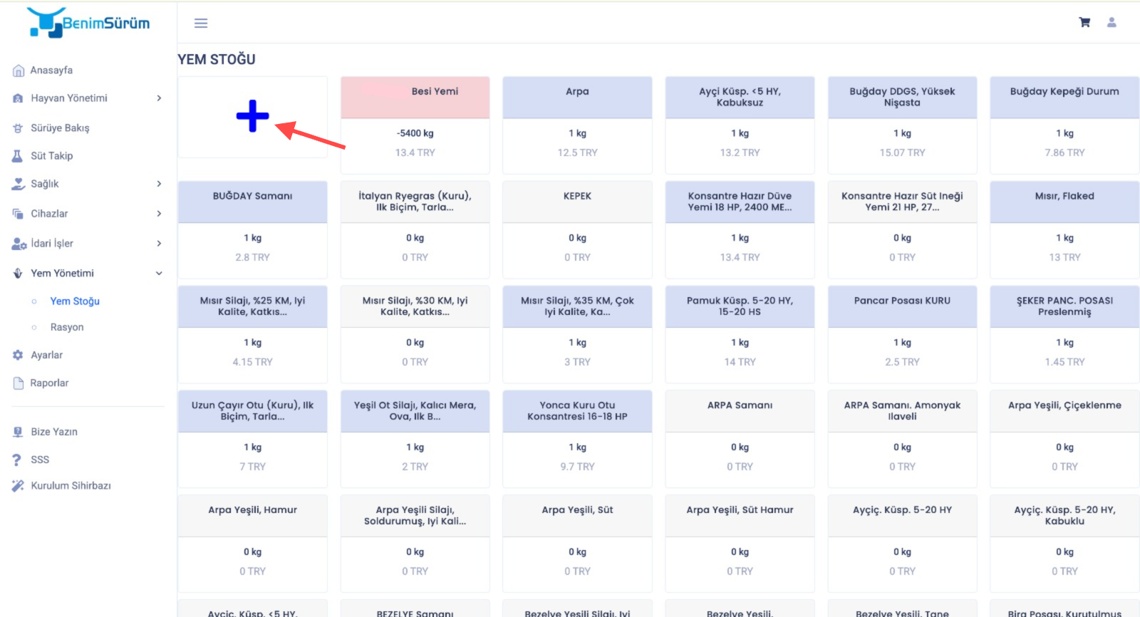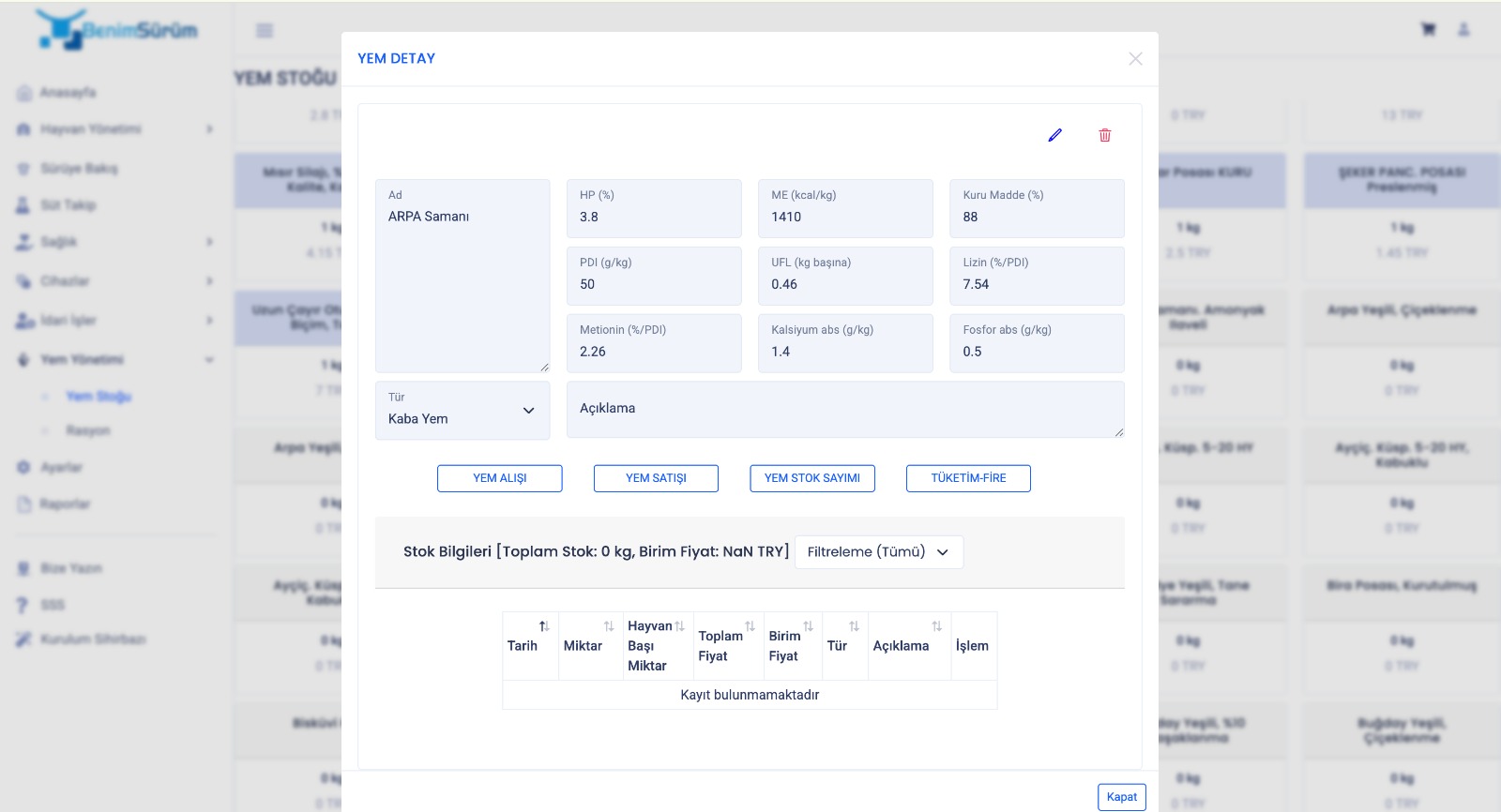 Benim sürüm uygulamanıza giriş yapın. Ana sayfada, sol menüde yer alan " Yem Yönetimi " sekmesine tıklayın. Öncelikle, "Yem Stoğu" bölümünden rasyonda kullanılacak yemlere ait stok ve maliyet bilgile…