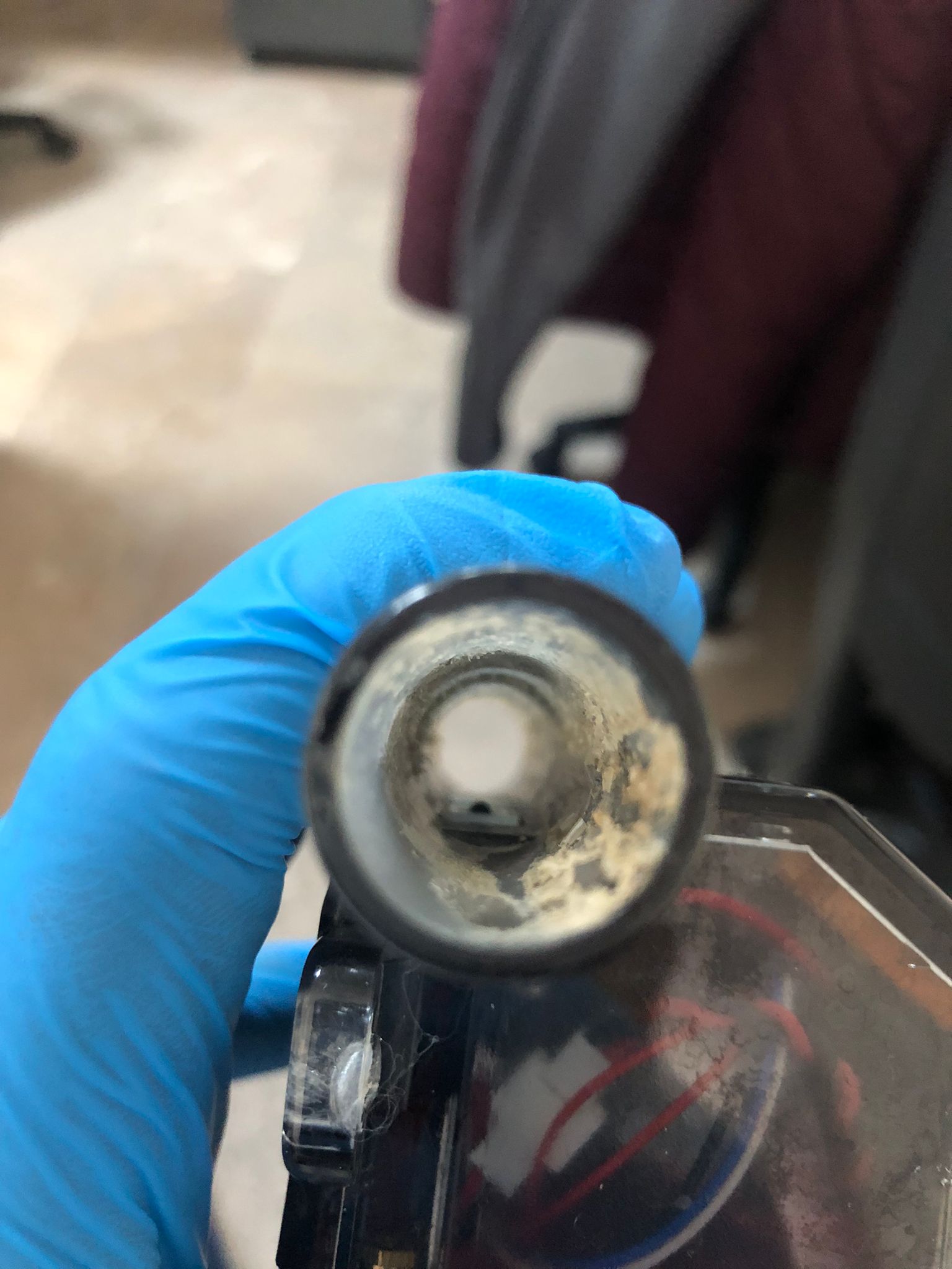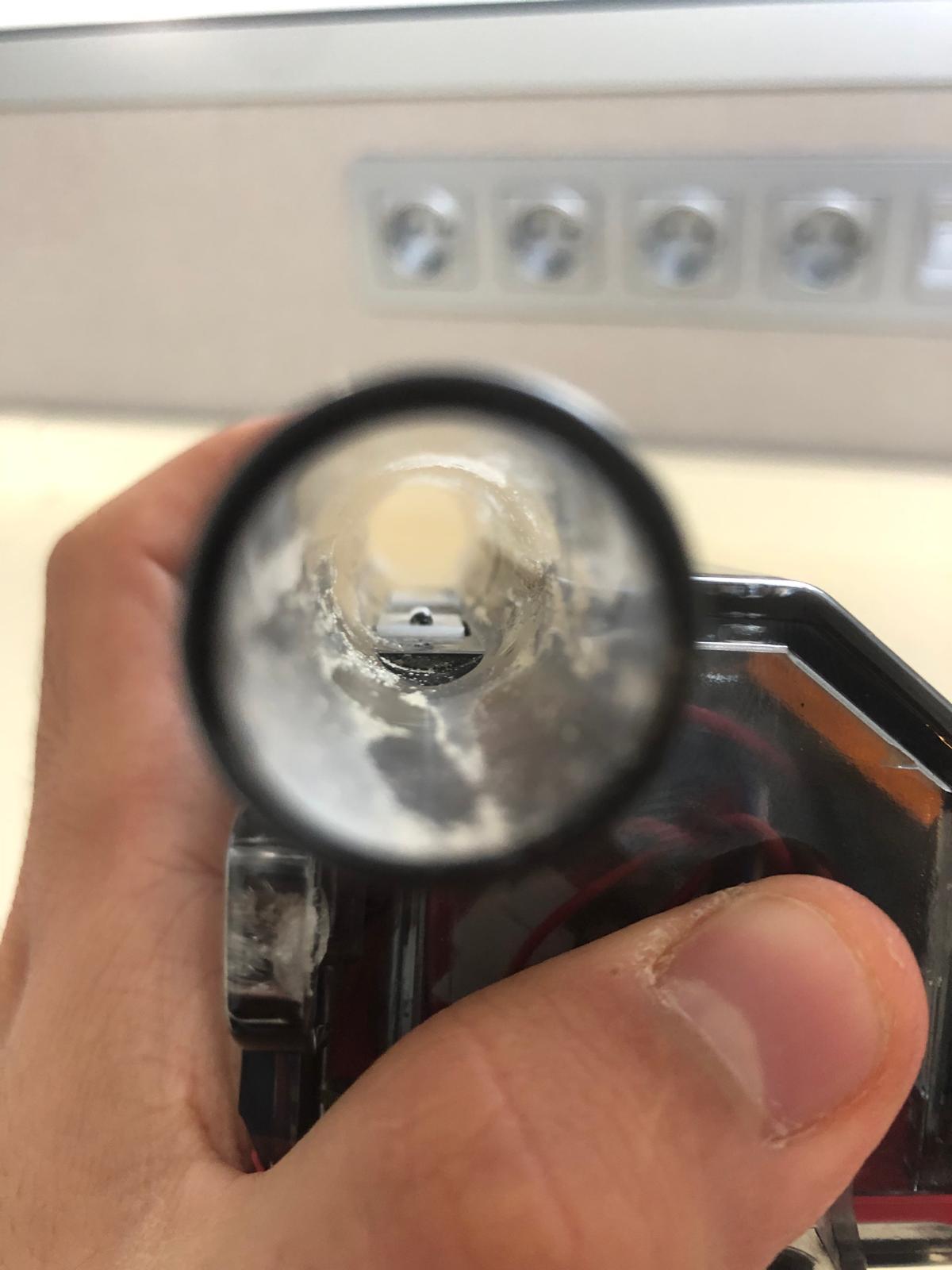 Cihazınızı öncelikle süt sisteminden güvenli bir şekilde sökünüz. Ardından, cihaz üzerinde süt geçen kısmı dikkatlice kontrol ediniz. Eğer aşağıdaki örnekte olduğu gibi kalıntı veya tortu görülüyorsa, bu durum süt sisteminde uygun temizlik protokollerinin uygulanmadığını gösterir ve sensör yüzeylerinin kirlenmesine neden olabilir.
