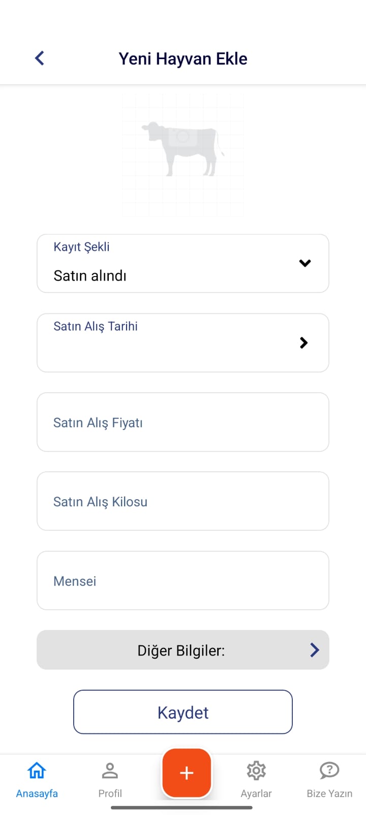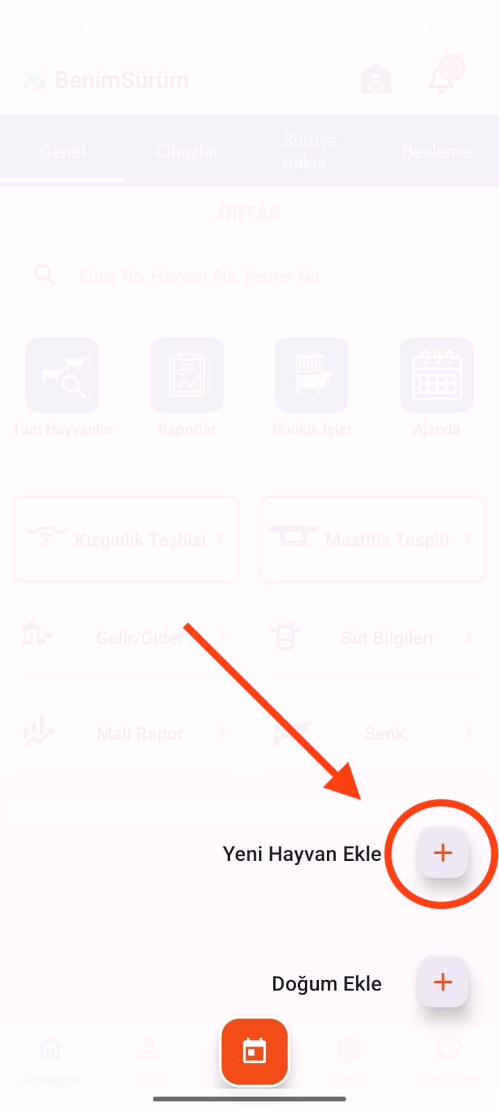 Benim Sürüm mobil uygulamasına giriş yapınız. Alt kontrol panelinde yer alan kırmızı “+” butonuna tıklayınız ve açılan ekranda Yeni Hayvan Ekle seçeneğini seçiniz. Açılan ekranda Yeni Hayvan Ekle seç…
