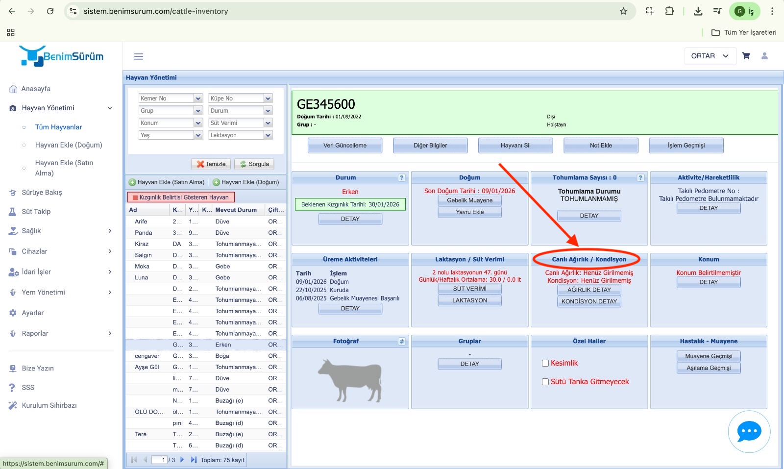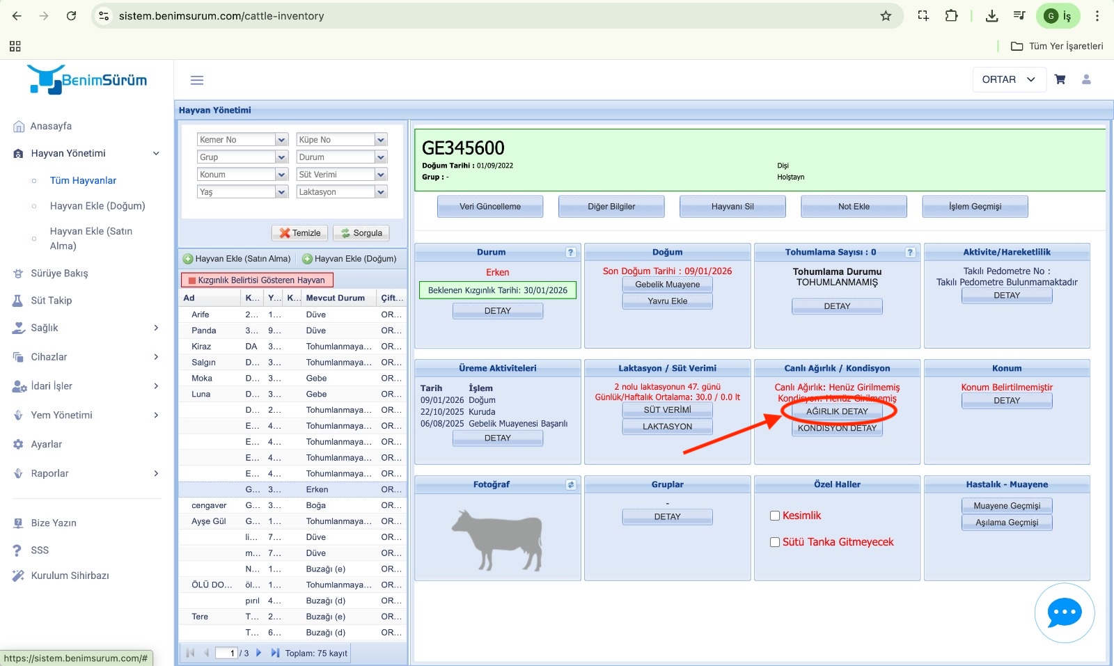 - Açılan ekranda, Tohumlama Bilgisi bölümünün altında yer alan Canlı Ağırlık sekmesine girin.
