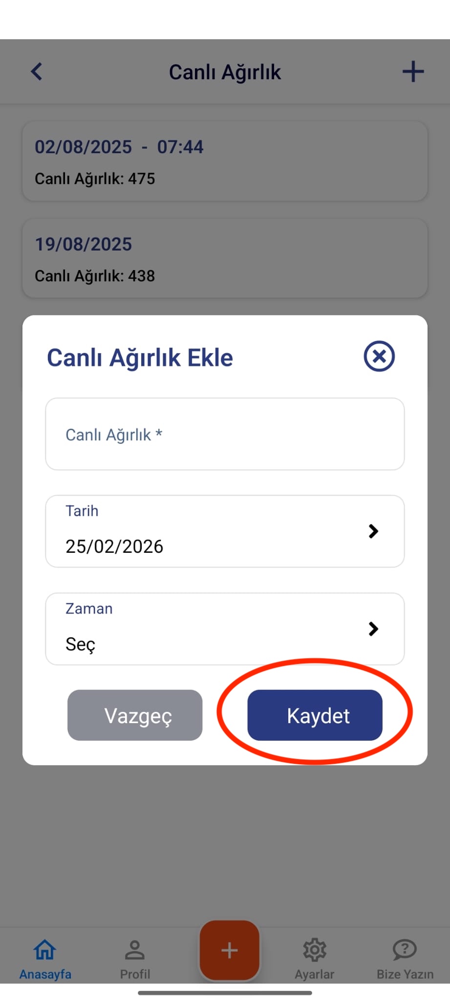 - Güncel ağırlık bilgisini girerek kaydedin.