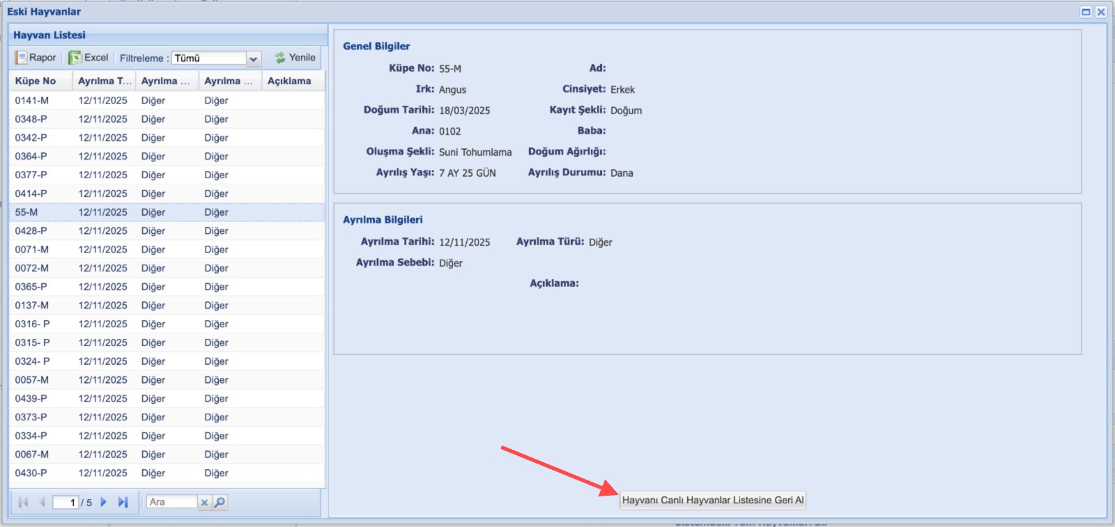 - Hayvanı seçtikten sonra "Hayvanı Canlı Hayvan Listesine Geri Al" butonuna tıklayın.