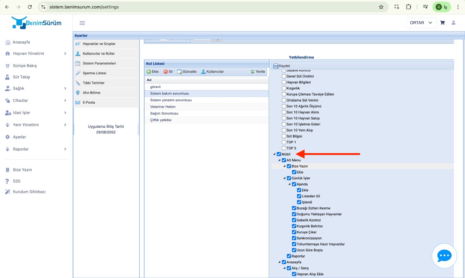 ⚠️ Önemli: Bu bölümde, kullanıcının mobil uygulamada görüntüleme ve işlem yapabileceği alanları da mutlaka seçiniz. Aksi takdirde kullanıcı mobil uygulamada sınırlandırılmayacaktır.
