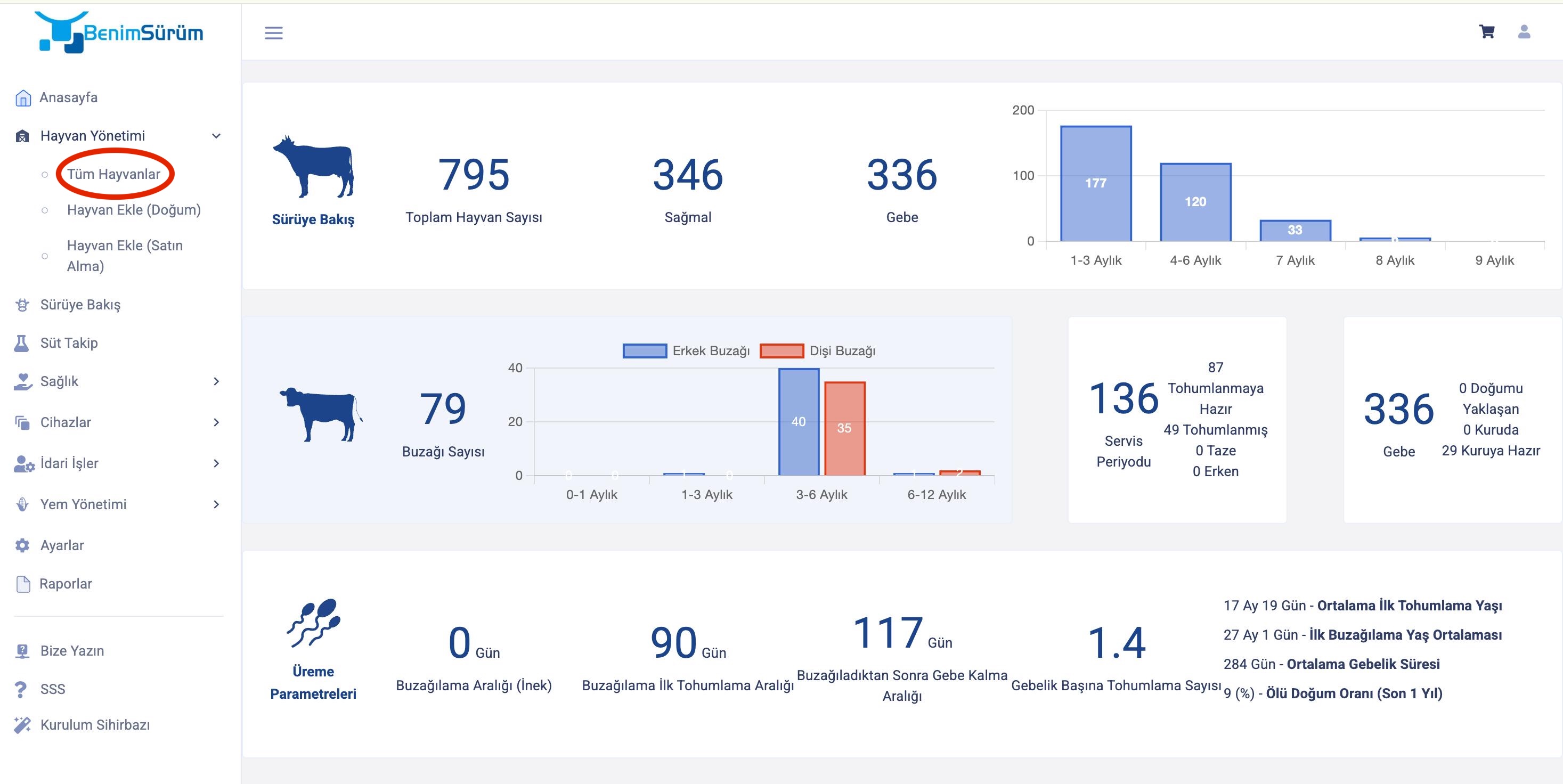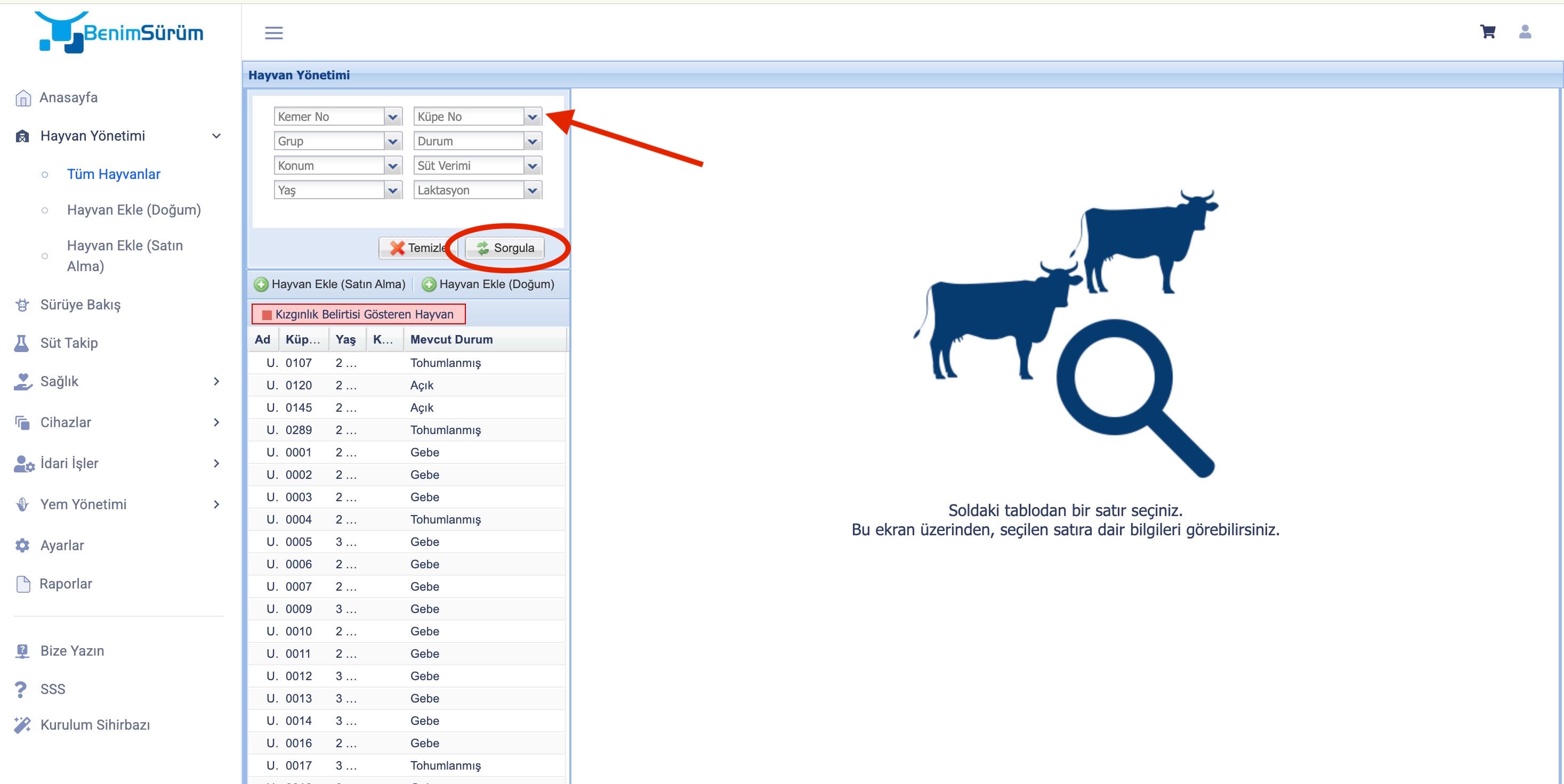 Benim sürüm uygulamanıza "G iriş Yapın".. Sol menüden “Hayvan Yönetimi” sekmesine tıklayın. Açılan ekranda “Tüm Hayvanlar” seçeneğini seçin. Hayvan yönetimi ekranında, “Küpe No” alanına sağım mal gru…