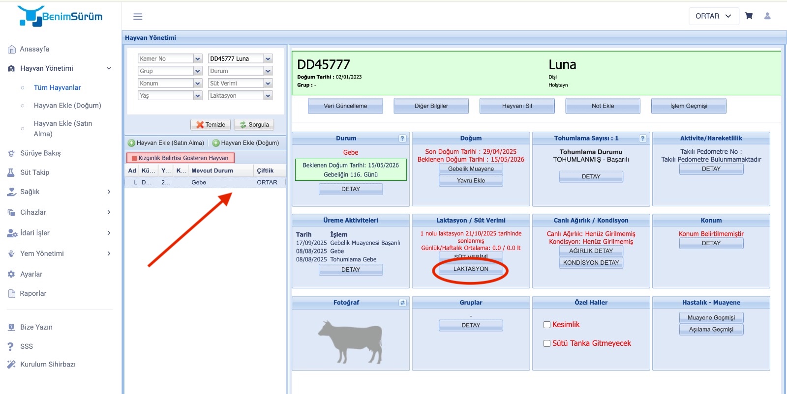 - İlgili hayvan listede görüntülenecektir. "Hayvan kartına" tıklayın. Ekranın sağ tarafında açılan "Hayvan Detay" bölümünde “Laktasyon – Süt Verimi” sekmesine geçin.