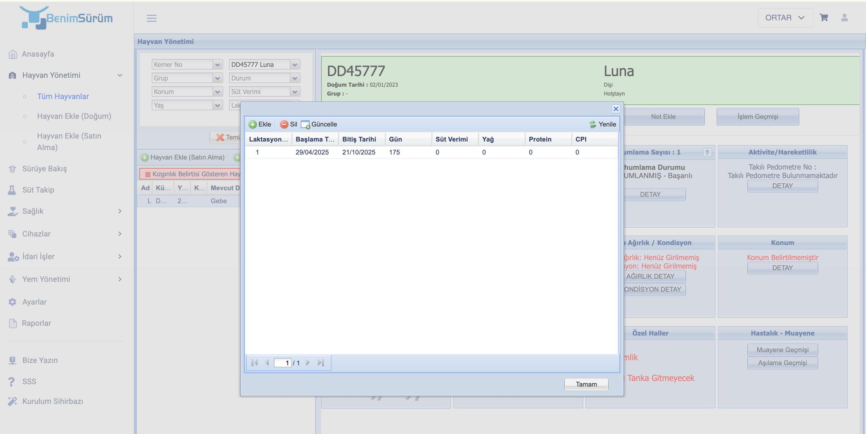 - Hayvana güncel bir laktasyon verisi ekleyebilir,
